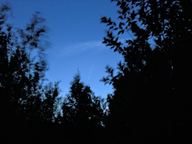 Это просто праздник какой-то! Классическая комета с хвостом, уверенно различимая невооружённым глазом в нижней кульминации, невысоко над горизонтом, на светлом небе!